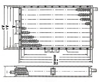 型號——通風正截面長度尺寸分米數(shù)的化整×通風正截面寬度尺寸分米數(shù)的化整(片趴代號)如通風正截面的長為1505mm,寬為1001,大型,片距為5mm,則為SRZ-15×10(D)。
